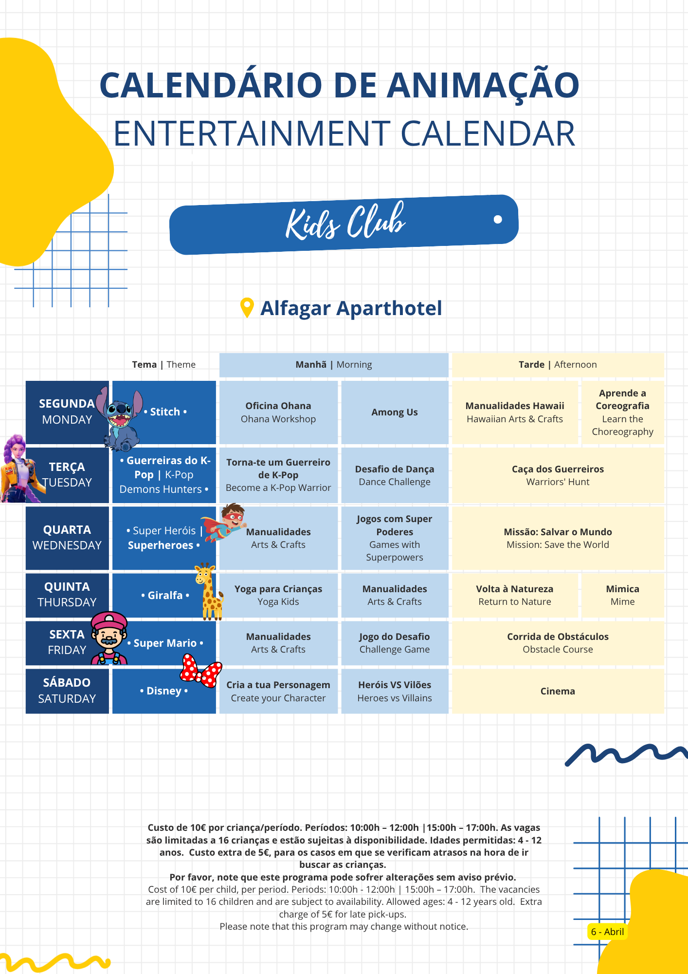 Todas as crianças podem participar no programa de atividades do nosso Kids Club. Vem ter conosco e prepara-te para as férias mais divertidas de sempre! Caso tenhas menos de 4 anos tens que trazer contigo um adulto.